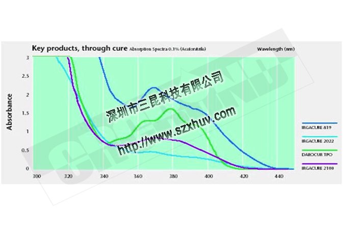 固化機(jī)理中,都是由光引發(fā)劑吸收紫外能量,產(chǎn)生活性基團(tuán),從而引發(fā)體系的聚合反應(yīng)。換句話說,光引發(fā)劑是否或者吸收哪些波段以及吸收了多少紫外能量,產(chǎn)生了多少活性基團(tuán),是UV膠是否固化,固化效果好不好的關(guān)鍵因素之一。下圖是幾種常見光引發(fā)劑的吸收光譜圖,可以看到不同引發(fā)劑在不同波段的吸收強(qiáng)度是有很大差異的。